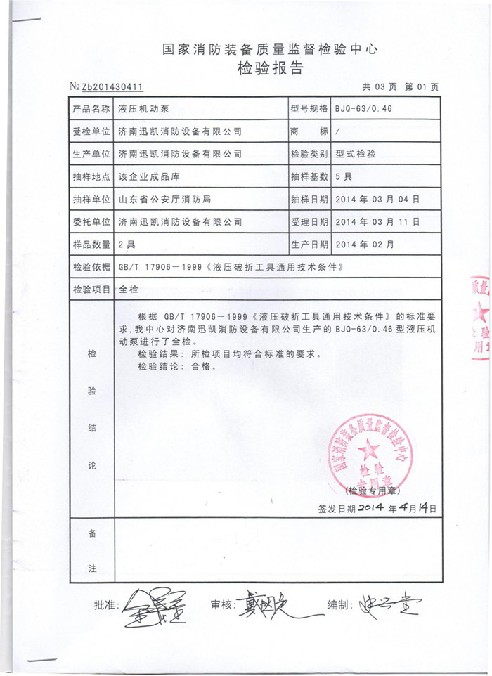 2014年1月,迅凱牌液壓破拆工具組中全部產(chǎn)品,由山東公安消防總隊(duì)抽樣封存,然后交由國家消防裝備監(jiān)督檢驗(yàn)中心進(jìn)行檢測。迅凱牌液壓機(jī)動泵、液壓手動泵、液壓擴(kuò)張器、液壓剪切器、液壓剪擴(kuò)器和液壓撐頂器等均通過了國標(biāo)測試,并頒發(fā)了認(rèn)證證書。